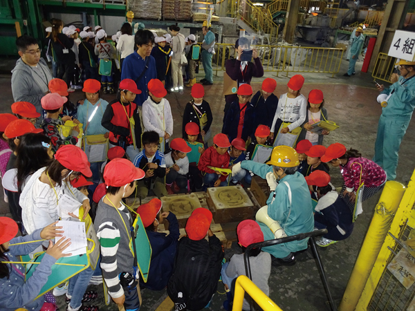 本社・朝日工場近くの朝日小学校3年生の皆さんが「地域の様子と働く人について」の学習の一環として本社・ 朝日工場を見学されました。生徒さんたちは、生産工程や出来上がった製品の説明を聴いて、熱心にメモをと っていました。鋳造ラインでは炉から出てきた真っ赤に 溶けた鉄に大歓声が上がりました。今後も当工場を見 学していただくことで”地元企業”カネソウに興味を持っていただくことを期待し ています。