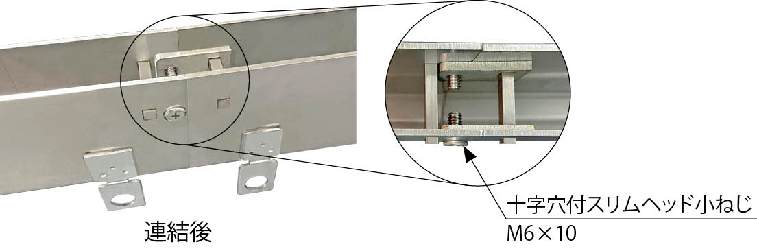 M6タップ加工付ジョイントピースの孔とトラフの孔位置を合わせ、お手持ちのプラスドライバーでねじを締め付けて連結します。
