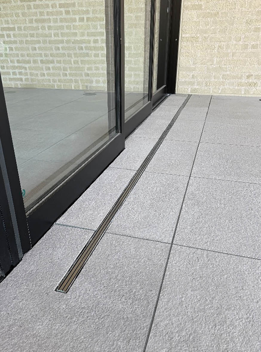 玄関(エントランス)などの建物出入口や、エレベーターなどの設備内への水の浸入を防ぎます。トラフ幅は28mmで、意匠性を重視したスペースに最適です。