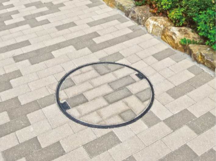 舗装材を充填できるスチール製ステンレス目地付の大口径マシンハッチ