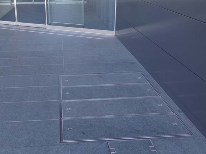石材、ブロックなどの床仕上材を充填できる、免震エキスパンションジョイント