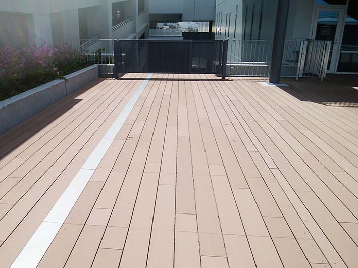 ウッドデッキ材を貼り込める、免震エキスパンションジョイント