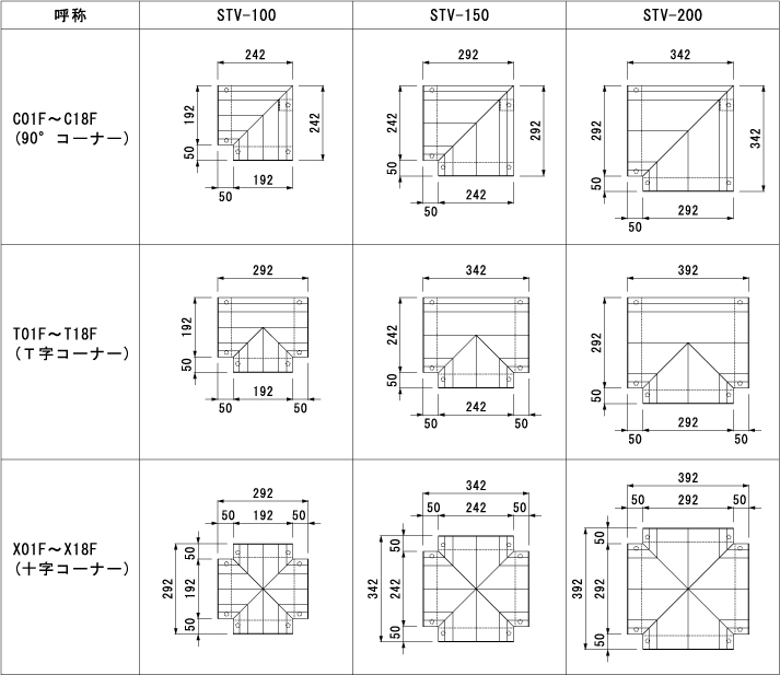 サニタリートラフ 90°コーナーとT字コーナーと十字コーナーの規格品の枠外寸法について