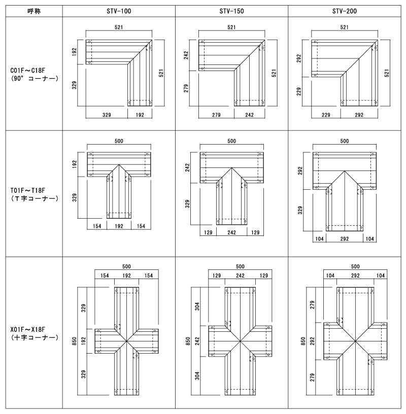サニタリートラフ 90°コーナーとT字コーナーと十字コーナーの規格品の枠外寸法を下記に示します。