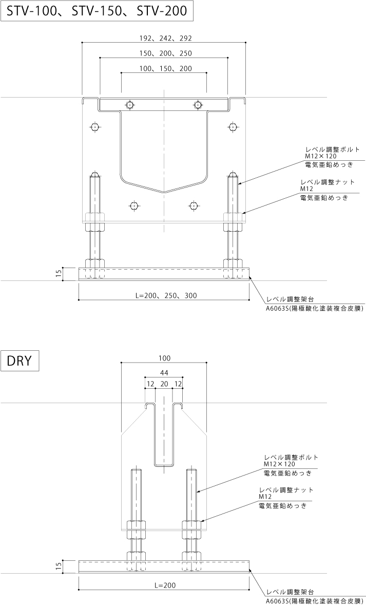 レベル調整架台のL寸法はSTV-100およびDRYはL=200、STV-150はL=250、STV-200はL=300です。