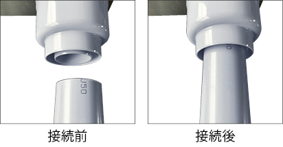 画像の様に塩ビ管VU50またはVU75を樹脂製トラップ所定の接続口に差し込みます。