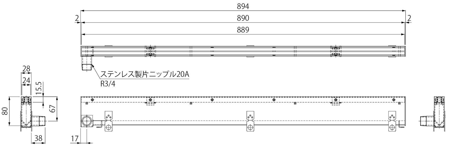 ※端部から20A片ニップルの排水口芯までは17mmとなります。