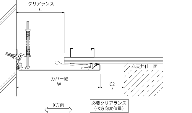 EXジョイント建物用 天井−内壁 SX45・AX45は、X方向の変位量を満たすために、カバー表側にクリアランスが必要です。