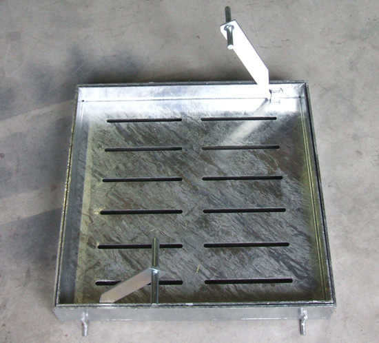 スチール製 砂利撒きカバー VTGC・VTGCW-Eは、蓋充填部の左手前側と右奥側の対角位置に蓋引き上げ部材を付けています。