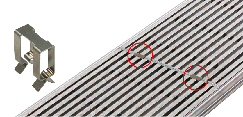 連結金具の脚部をメインバーのすきまに差しこみ、連結するグレーチングの端部エンドバーを挟むようにして、押し込むことで取付完了です。