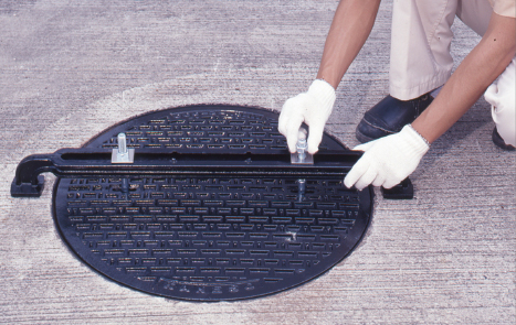 A鉄蓋の把手部にフックを掛け、本体を六角ナット、角座金で固定します。
