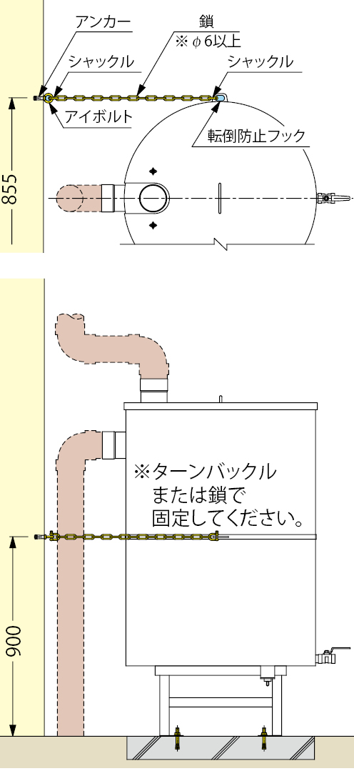 ※鎖の代わりにターンバックルとボルトを使用する場合、ボルト径はM10以上としてください。