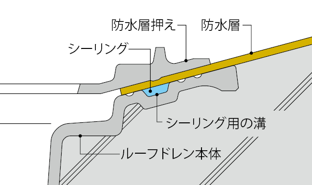 - 防水層との接着をより確実にするために、ルーフドレン本体に接着補助溝を設けています。