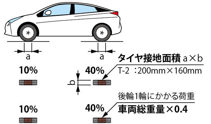 輪荷重は車両総重量の前輪片側10%、後輪片側40%の割合で荷重がかかるとして強度計算しています。