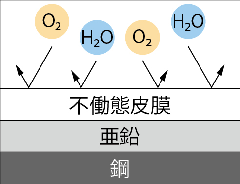 溶融亜鉛めっきは、大気中の酸素などと化学反応を起こし、不働態皮膜を形成し、亜鉛めっきの消耗を低下させます。