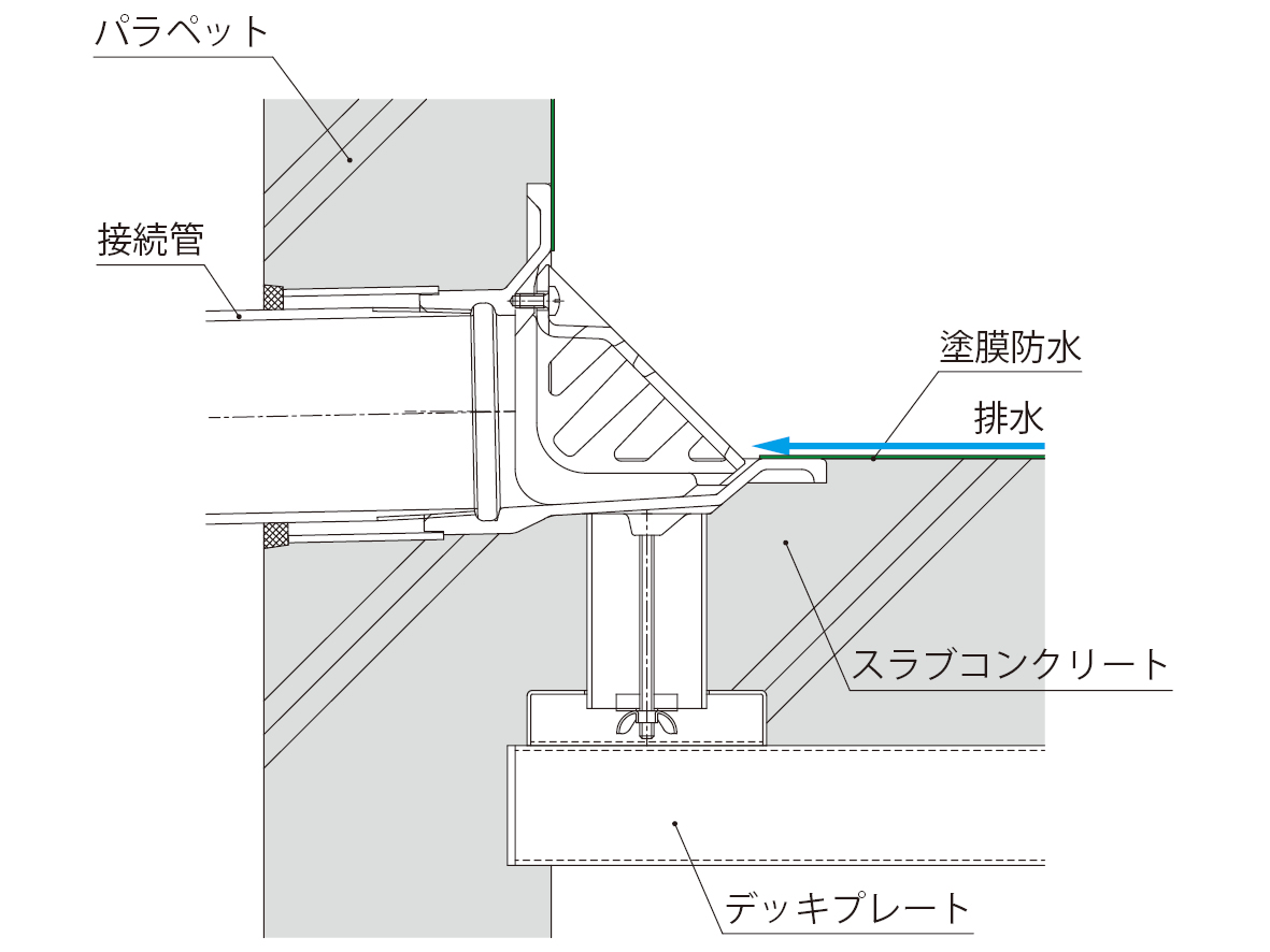 本体形状がフラットで雨水が流れやすく、押えコンクリートのない塗膜防水に最適です。
